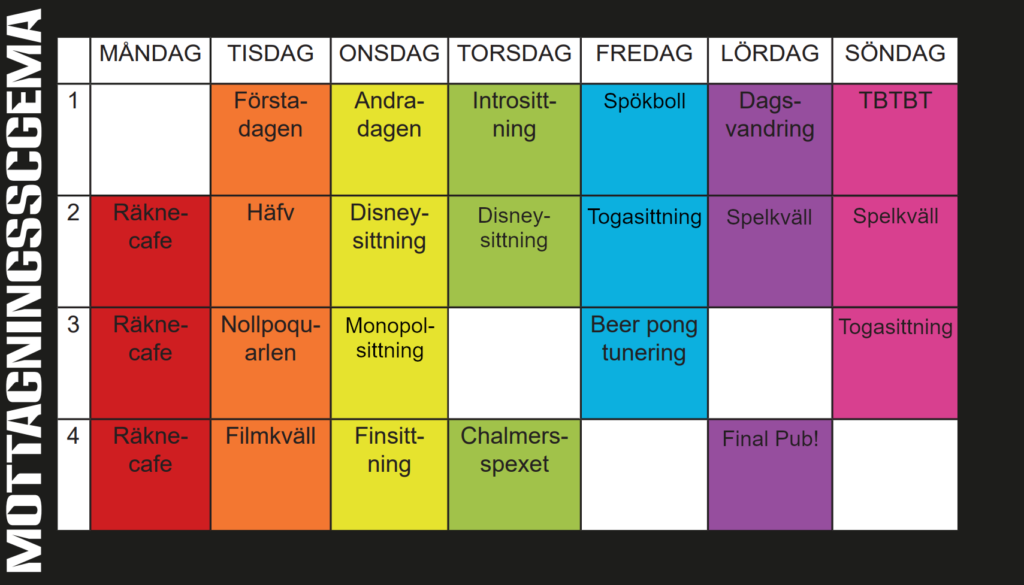 Här är årets mottagningsschema, oj så mycket skoj! Vi kommer släppa uppdateringar här och på facebook i gruppen Tekniskt basår Chalmers 2020, håll utkik!